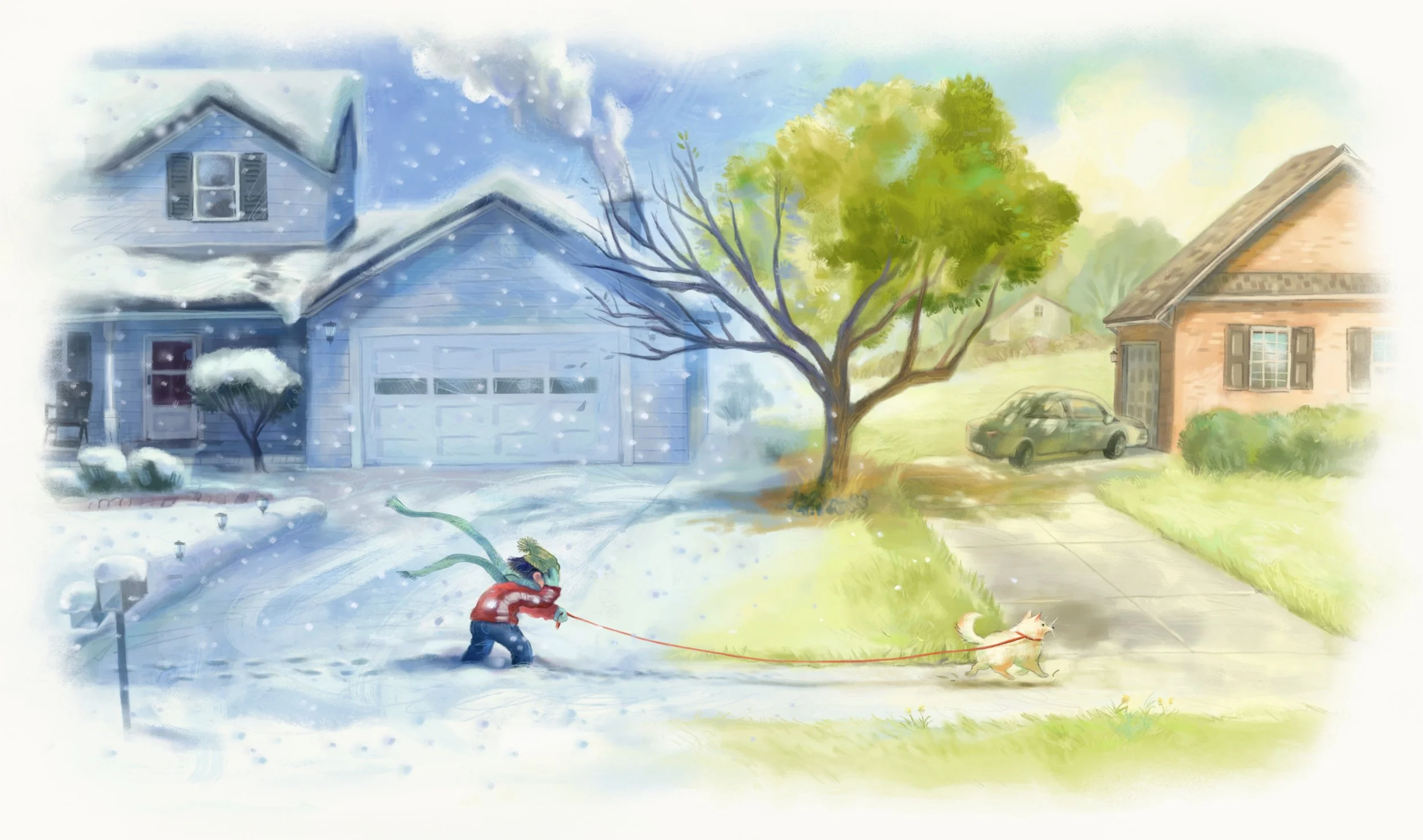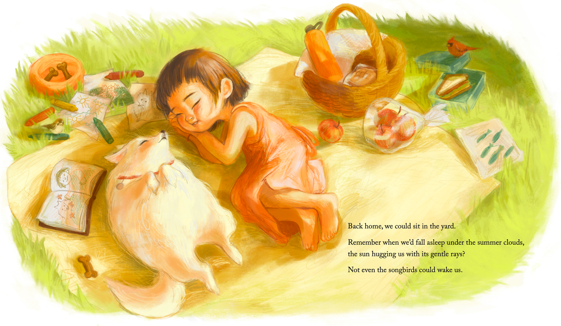 In the months that followed, I began writing down all the things Bailey and I loved doing together. When assigned a final project in my RISD Picture and Words class, I transformed the memoir into a manuscript. I explored various compositions in an effort to recapture our memories together, hoping to create an uplifting and beautiful story about grief and loss—a gentle, warm embrace for those experiencing sorrow.